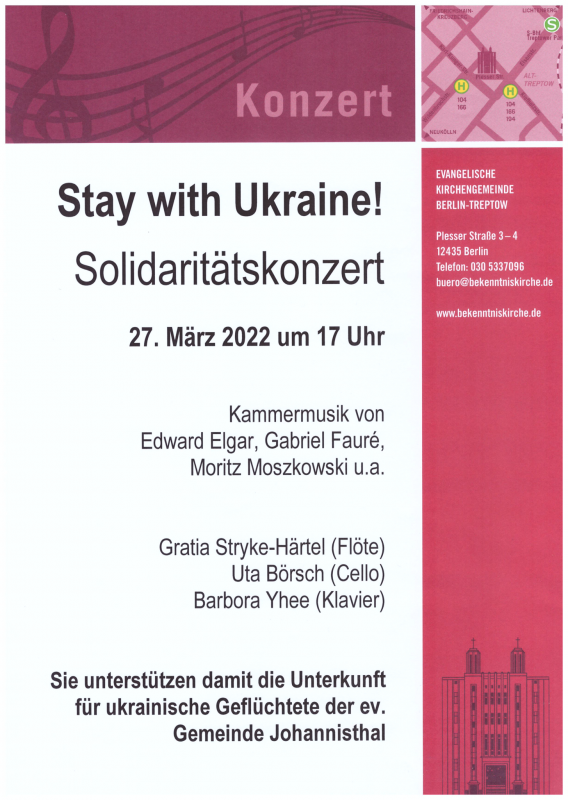Solidaritätskonzert „Stay with Ukraine!“ am Sonntag, 27. März 2022, 17 Uhr in der Treptower Bekenntniskirche