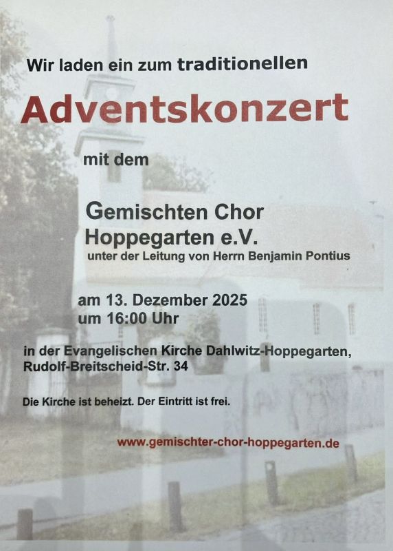 Adventskonzert mit dem Gemischten Chor Hoppegarten e.V. am 13. Dezember 2025 um 16 Uhr in der Evangelischen Kirche Dahlwitz-Hoppegarten
