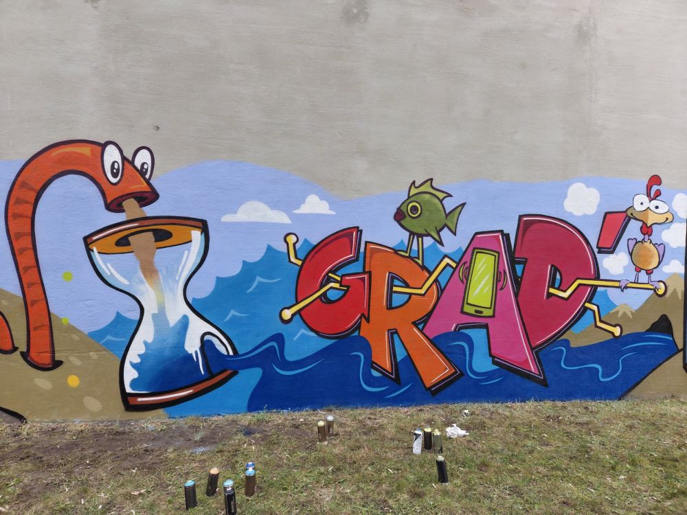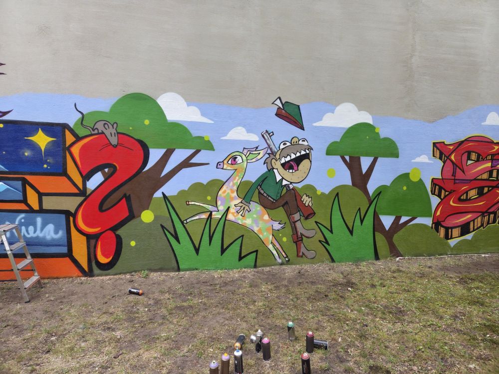 In der zweiten Phase bei trübem Himmel, aber strahlender Motivation wurde die Rückwand der Turnhalle in hellem Blau grundiert. Der Geschäftsführer der Graffiti-Agentur sagte hinterher: „So ein durchgehend engagiertes Mitmachen bis zum Schluss habe ich selten erlebt.“ Und er begleitet mit Schulen häufiger Projekte mit Jugendlichen.