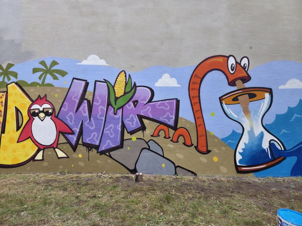 Der zentrale Umsetzungstag begann früh. Die Agentur zog die Konturen vor, dann griffen die Jugendlichen zur Dose. Spontane Ideen wie ein Maiskolben, ein Huhn oder der Spaten aus der letzten Sommerfreizeit flossen ebenso ein wie tiefere Motive. Etwa ein Sandwurm, der Sand in einer Sanduhr in sich reinigendes Wasser verwandelt. Ein Bild, das erst bei längerer Betrachtung eine theologische Dimension eröffnet: Verwandlung, Reinigung, neues Leben zwischen menschlicher Endlichkeit und Gottes Ewigkeit.