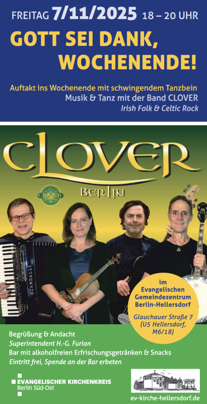 GOTT SEI DANK, WOCHENENDE! 7/11/2025, 18 bis 20 Uhr, Andacht, Musik & Tanz MIT DER BAND CLOVER Irish Folk & Celtic Rock, Evangelisches Gemeindezentrum Berlin-Hellersdorf