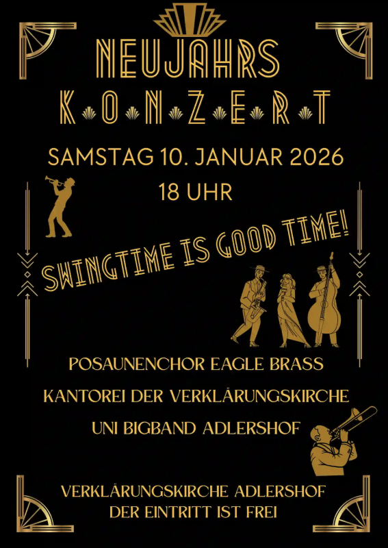 Neujahrskonzert SWINGTIME IS GOOD TIME! am Samstag, 10. Januar 2026, 18 Uhr in der Verklärungskirche Adlershof: Posaunenchor Eagle Brass, Kantorei der Verklärungskirche, Uni Bigband Adlershof – Eintritt frei!