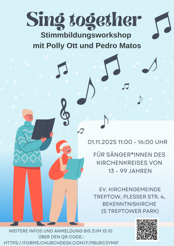 Sing together – Stimmbildungsworkshop mit Polly Ott und Pedro Matos, 1. November 2025, 11 bis 16 Uhr, Bekenntniskirche, Plesser Str. 4, 12435 Berlin-Treptow: für Sänger*innen von 13 bis 99 Jahren – Anmeldung bis 20. Oktober 2025!