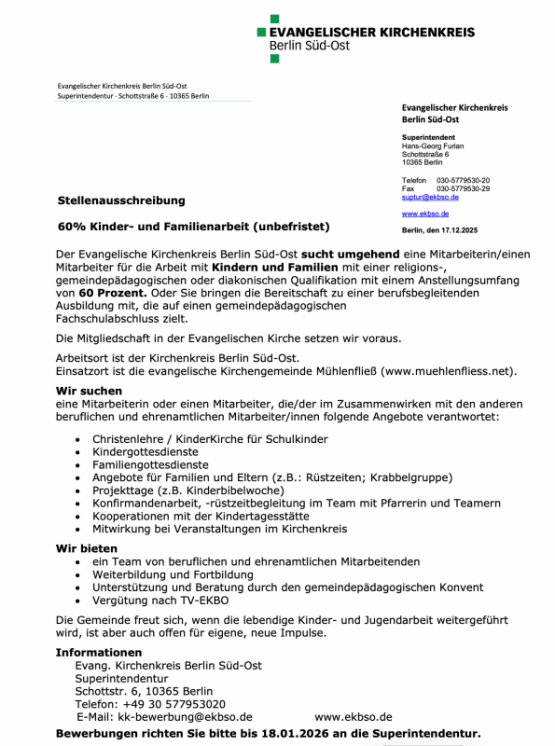 Stellenausschreibung des Ev. Kirchenkreises Berlin Süd-Ost: 60 Prozent Kinder- und Familienarbeit (unbefristet)