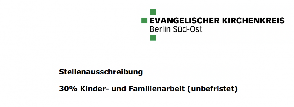 Der Evangelische Kirchenkreis Berlin Süd-Ost sucht umgehend eine Mitarbeiterin/einen Mitarbeiter (m/w/d) für die Kinder- und Familienarbeit mit einem Anstellungsumfang von 30 Prozent (unbefristet)