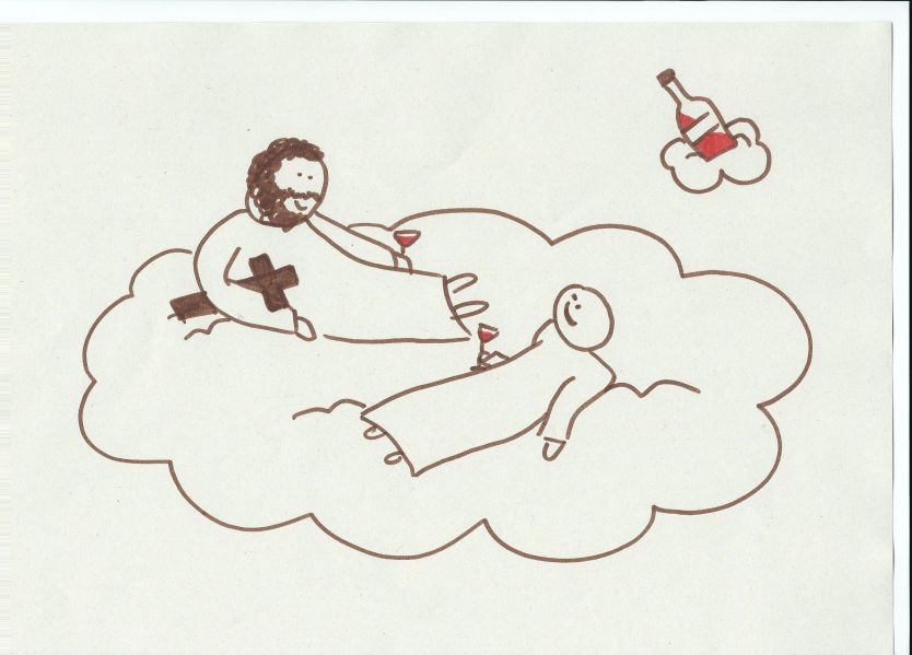 Und was macht eigentlich Jesus, wenn er sich ausruhen möchte? Nun war es an jedem selbst, sein persönliches Bild von Jesus, seine eigene Definition in Worte zu fassen und ihn als Person zu verstehen versuchen. Sicher schläft er, döst entspannt unter einem Baum. Vermutlich kehrt er in sich, um allein zu sein, an abgeschiedenen Orten – oder … halt! Kehrt er vielleicht bloß in sich, um bei Gott zu sein und neue Kraft zu schöpfen? Er wird oft gebetet haben. Und er hat Menschen zusammengeführt – um seinen Frieden mit sich zu machen, wenn er ihnen etwas mit auf ihren Weg geben kann? Hat ihn das befreit? Und ist es entspannend Wasser zu Wein machen zu können? Kein Zweifel, das muss es sein.
