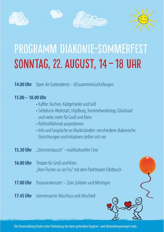 Das Diakonie-Sommerfest am 22. August 2021 im Pfarrgarten der Ev. Kirchengemeinde Lichtenberg startet um 14 Uhr mit einem Familiengottesdienst – speziell auch für die Schulanfänger*innen. Unter dem Motto #ZusammenGutAnfangen laden in der Möllendorffstraße 33 Mitmachangebote wie ein Trommelworkshop und eine Siebdruck-Werkstatt, eine Hüpfburg, Kaffee, Kuchen und Gegrilltes zum Verweilen ein. Und die Besucher*innen haben an diesem Sonntagnachmittag Gelegenheit, ein Rollstuhlfahrrad auszuprobieren. Auf dem Programm steht außerdem „Das Märchen vom Fischer und sin Fru“, aufgeführt vom Parktheater Edelbruch.