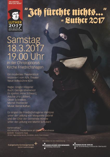 Nach der erfolgreichen Premiere vor wenigen Wochen in Düsseldorf kommt das Luther-Theaterstück „Ich fürchte nichts ...“ jetzt auch nach Berlin. Bitte vormerken! Am Samstag, 18. März 2017, um 19 Uhr werden die Schauspielerinnen und Schauspieler des N.N. Theaters Neue Volksbühne Köln gemeinsam mit der Friedrichshagener Kantorei und mit dem Chor der Gemeinde Hönow in der Christophoruskirche in Berlin-Friedrichshagen zu sehen und zu hören sein.