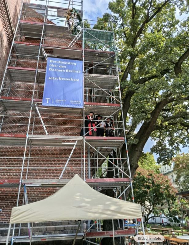 Es wird! Mit dem Richtfest an der Stadtkirche geht die Sanierung auf die Zielgerade. Im Juni 2026 soll das Flaggschiff der Gemeinde wieder vollumfänglich nutzbar sein. Der neue Dachstuhl lässt sich inzwischen mehr als nur erahnen. Ist das Dach ganz fertig, kann die Innensanierung weitergehen. Zum Richtfest erschienen waren neben den Teams der beteiligten Gewerke und des Architekturbüros Bernrieder und Sieweke Vertreterinnen und Vertreter der Gemeinde und des Gemeindekirchenrats, des Bezirks und des Kirchenkreises. Das Zimmermannsritual zum Richtfest, bei dem Torsten Rotheudt, Geschäftsführer der Dachdeckerei Pause, einen Toast auf Bauherrn und Baugewerke ausbrachte und am Ende das zuvor geleerte Sektglas symbolisch unterhalb der Richtkrone an der Kirchenmauer zerschlug, verfolgten 50 geladene Gäste. Pfarrer Ralf Musold spendete allen Beteiligten zum Abschluss einen Segen. Die Stadtkirche ist seit Juli 2024 zur umfänglichen Sanierung geschlossen. Fünf Millionen Euro werden in die Erneuerung des über 280 Jahre alten Gotteshauses investiert. (Quelle: Ev. Stadtkirchengemeinde Köpenick)