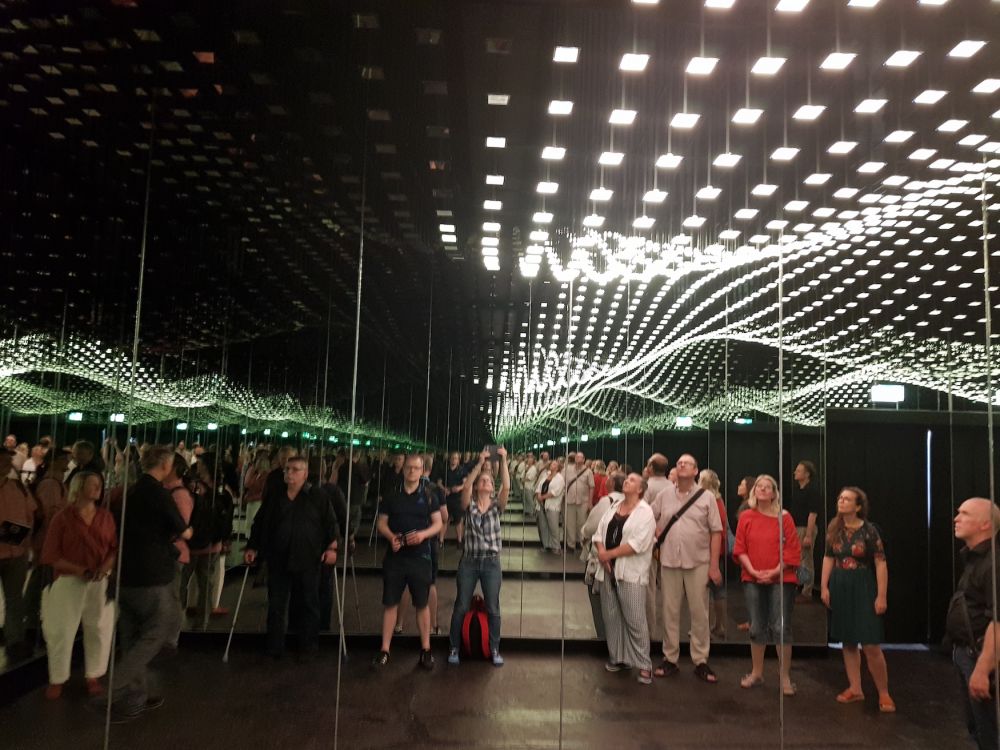 2023 stand nun ganz im Zeichen von „Licht und Schatten“. Am 7. Juli ging es in die Ausstellung „Dark Matter", der Kirchenkreis hatte die Räume in Berlin-Lichtenberg für eineinhalb Stunden gebucht. Die Bildergalerie am Ende dieses Artikels vermittelt einen guten Eindruck davon, was die mehr als 60 Synodalen und hauptamtlich Mitarbeitenden in den Ausstellungsräumen erleben und mit allen Sinnen erfahren konnten: Klang- und Lichtinstallationen, Momente der Entspannung und Momente überraschender Farb- und Schattenspiele. O-Ton vieler Gäste des Dankeschönabends: Muss man selbst mal gesehen, gehört, erlebt haben, super Idee! Anschließend ging es zum geselligen Miteinander auf das Gelände der Erlöserkirche in Berlin-Lichtenberg – mit viel Austausch und Gesprächen mal jenseits der Synodenhektik.