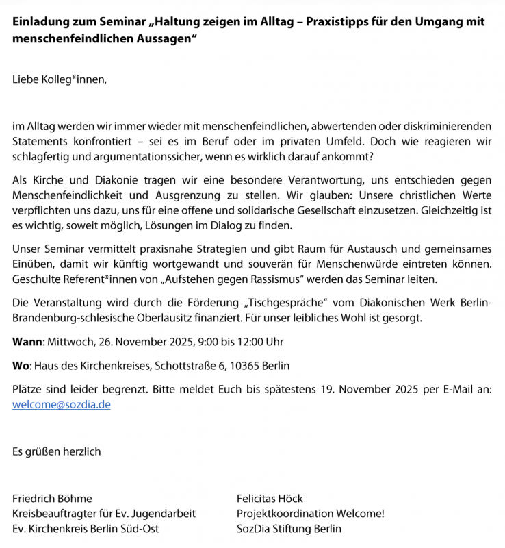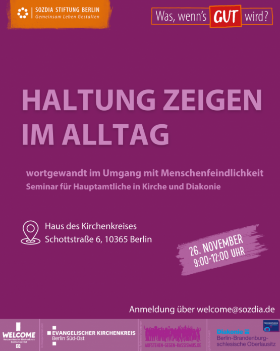 Seminar "Haltung zeigen im Alltag – Praxistipps für den Umgang mit menschenfeindlichen Aussagen", Mittwoch, 26. November 2025, 9 bis 12 Uhr, Haus des Kirchenkreises, Schottstr. 6, 10365 Berlin