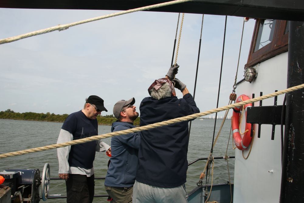 Am nächsten morgen warteten die Skipper auf beiden Schiffen auf uns. Weniger gute Nachrichten: Nach einem Segeltag auf dem Ijsselmeer müssen wir uns zwei Tage auf kleineren Gewässern und der Ijssel (dem nördlichsten Nebenarm des Rheins) „verstecken“ – zu starker Wind war angekündigt. Kampen und Hasselt waren unsere Ziele. Das tat der guten Stimmung auf beiden Schiffen keinen Abbruch. Segel hissen und einholen war trotz der Enge des Flusses angesagt, wir hatten den Wind ja vorerst im Rücken. Die Kinder verbrachten den ganzen Tag in der Steuerkabine und halfen Kim und Rianne (Skipperehepaar auf der Grietje) das Schiff auf Kurs zu halten. Genauso war auf der Vriendschap. Abends wurde auf den Schiffen gekocht, gemeinsam gegessen, „Henriette“ oder Hitster gespielt, gebadet, gesungen und Andacht gehalten. Gute, offene Gespräche entwickelten sich auf beiden Schiffen, wir lachten viel miteinander, halfen uns gegenseitig beim Segeln, Einkaufen, Kochen.