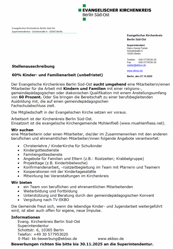Stellenausschreibung des Ev. Kirchenkreises Berlin Süd-Ost: 60 Prozent Kinder- und Familienarbeit (unbefristet)